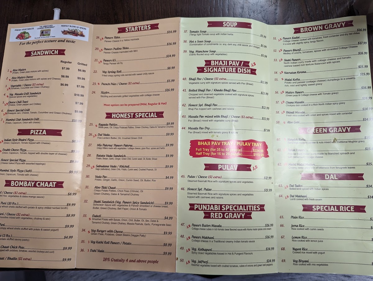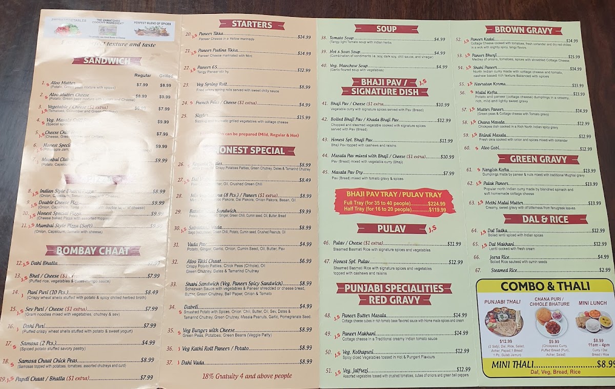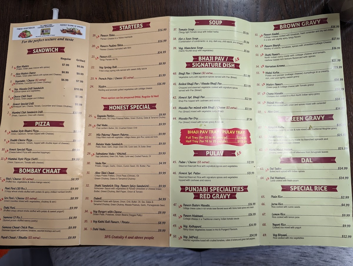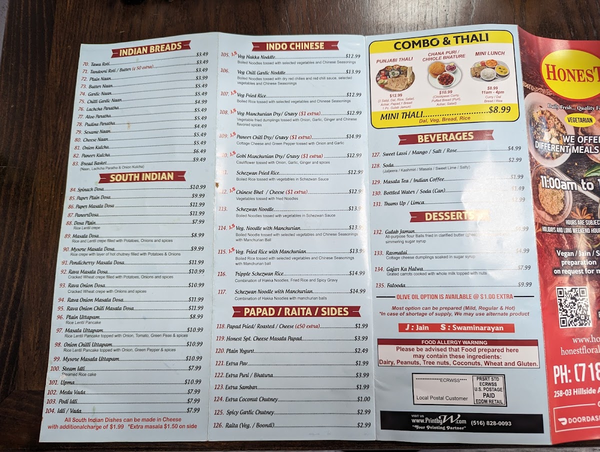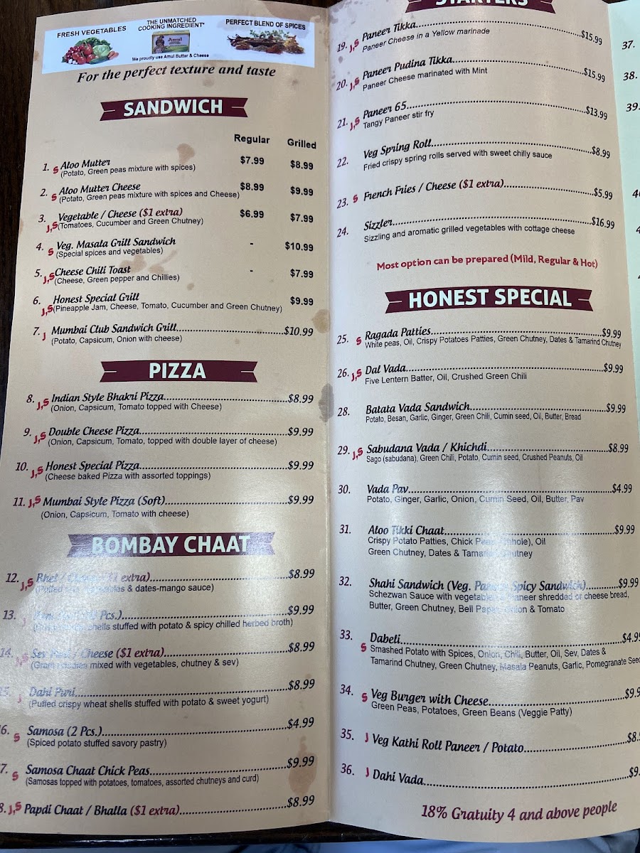 Introducing the menu of Honest Indian Restaurant, a culinary gem located in Queens, NY, offering a delightful journey through authentic Indian flavors. The menu is a tapestry of traditional dishes, including standout favorites like Chhole Bhatura, which has garnered rave reviews for its authentic taste and soft bhaturas, even after delivery. The rich variety extends to mouthwatering Punjabi thali and aromatic Dosas, intricately crafted to evoke nostalgia.